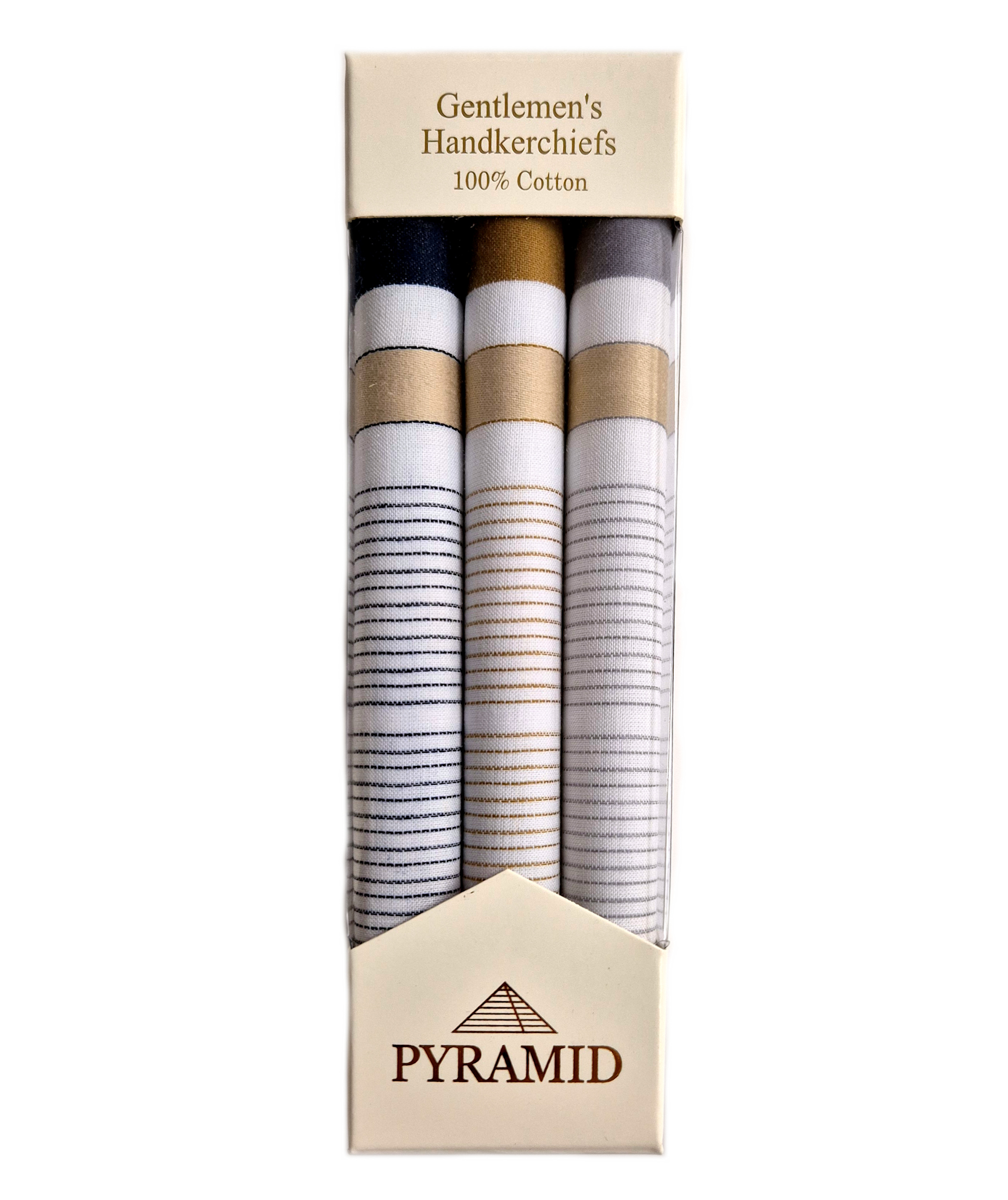 Mens Pyramid White with Fine Coloured Stripe 3 Pack Cotton Handkerchief