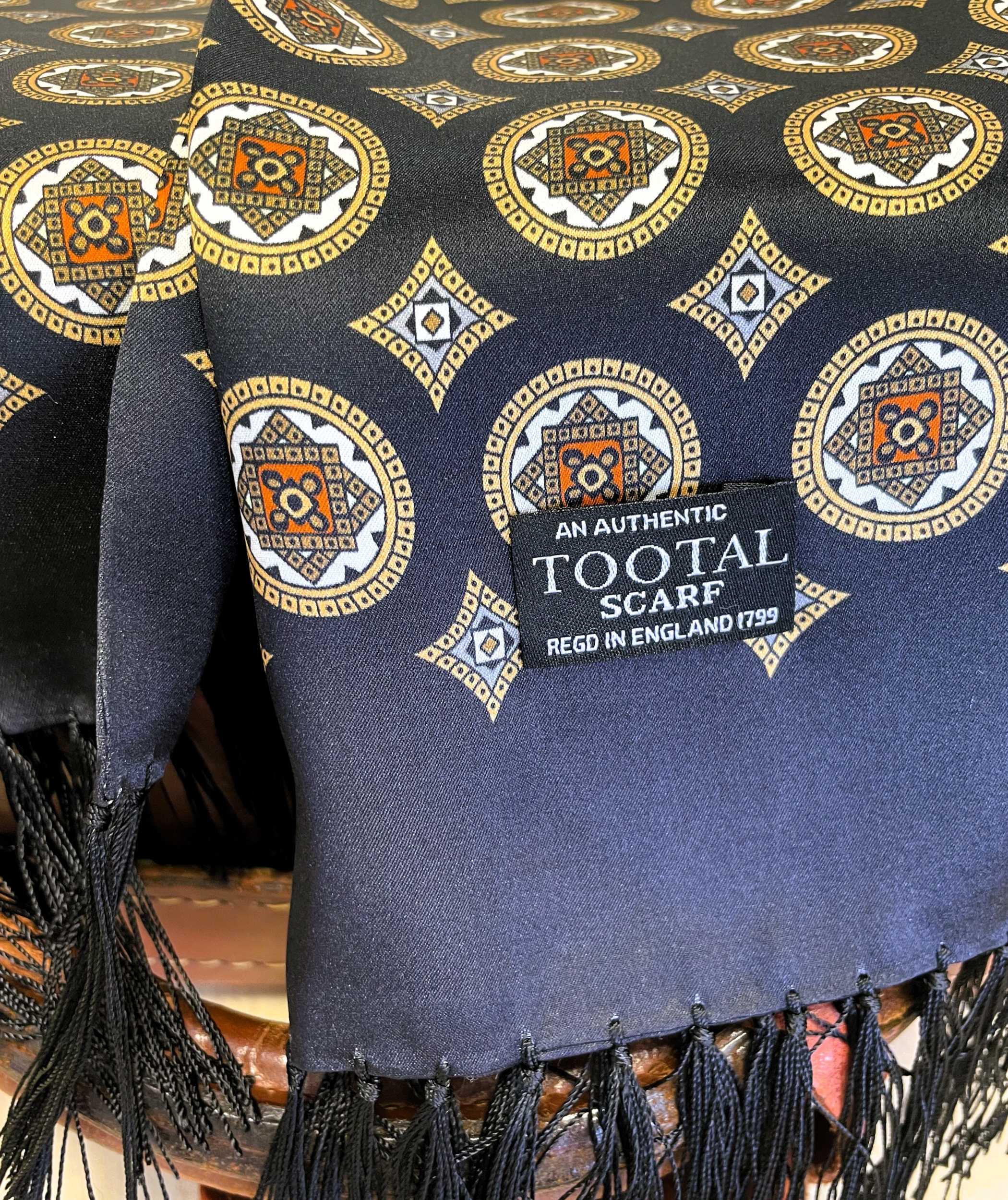 Tootal Black & Gold Medallion with Border Silk Scarf – Classic Medallion Pattern in Pure Silk