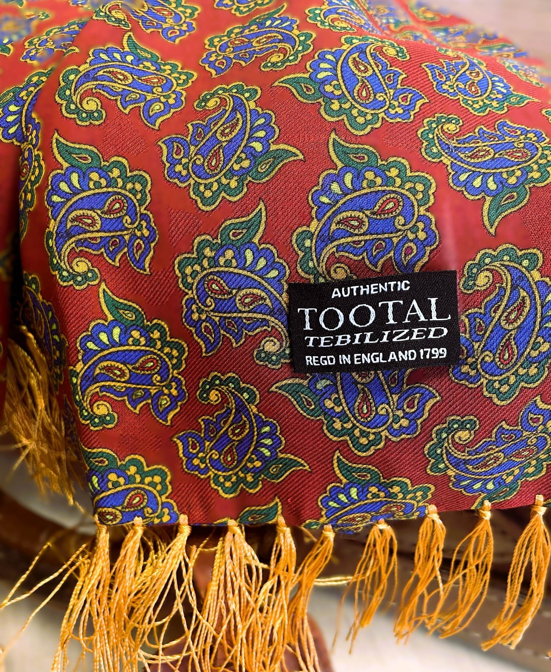 Tootal Blue Paisley on Red Rayon Scarf with Gold Fringe