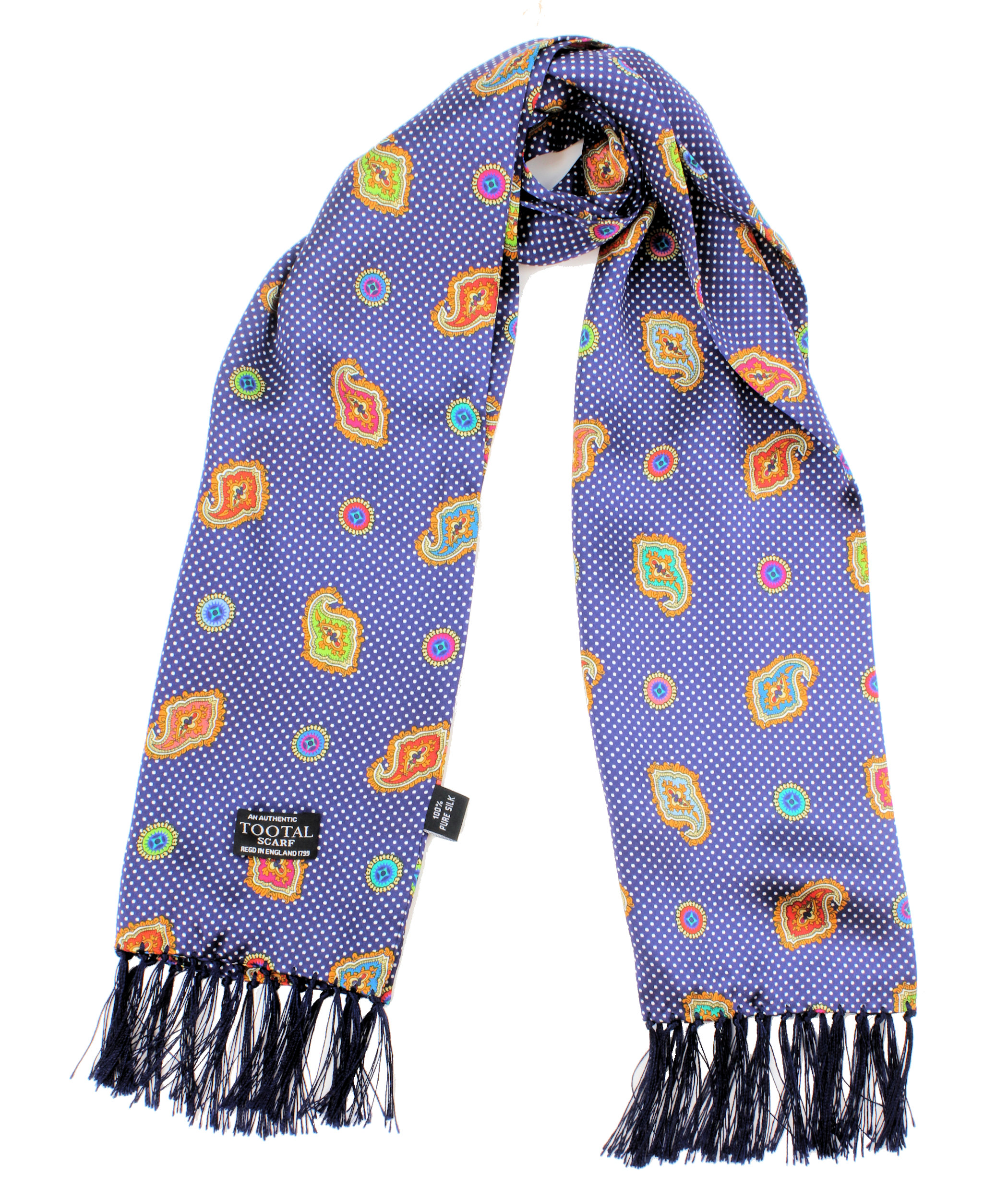Authentic Tootal scarf in navy blue with polka dot and paisley print design navy fringe.